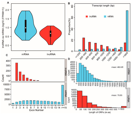 Comparison of genomic features of mRNAs and lncRNAs. (A) Expression levels of total mRNAs and lncRNAs using log10 (FPKM + 1). (B) The transcript length of mRNAs and lncRNAs. The x axis represents the length of transcripts, and the y axis represents the composing proportion. (C) Distribution of exon numbers of mRNAs and lncRNAs. (D) Distribution of open reading frames (ORFs) lengths in mRNAs and lncRNAs.