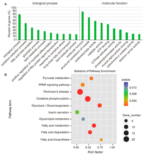 Potential targets of lncRNAs in cis-regulatory relationships were predicted using pathway analysis, which showed that the top ten Kyoto Encyclopedia of Genes and Genomes (KEGG) pathways were related to “fatty acid metabolism”, “PPAR signaling pathway”, “oxidative phosphorylation”, and “glycolysis” (Figure 6B). Previous studies have found that triglyceride concentration (7 mM vs. 4.2 mM) and lipid droplets (0.5% vs. 0.1%) in slow (oxidative) fibers are lower than that in fast (glycolytic) fibers [43,44]. Here, we found genes, including fatty acid translocase (FAT/CD36) and fatty acid-transport protein 6 (FATP6), were annotated to “fatty acid biosynthesis” pathway (ko.00061). These two genes were proven to regulate the process of transferring fatty acid from serum into muscle [45]. The PPAR signaling pathway was involved in the regulation of PPARβ-PGC1α signaling cascade, which is the most crucial network responsible for fiber-type switching [34]. Therefore, these findings indicate that lncRNAs play an important role in cis-regulating different phenotypic traits between oxidative and glycolytic skeletal muscles.