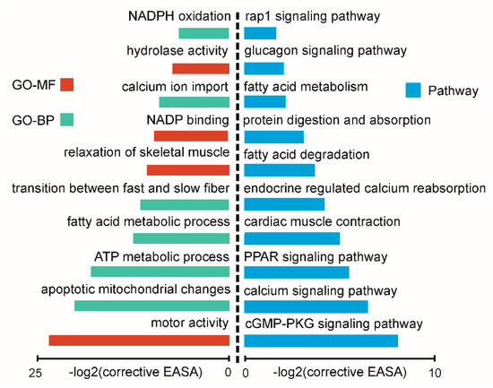 Recently, many studies have shown that circRNA expressions could be regulated by linear transcripts derived from host genes [46,47]. Therefore, to explore the mechanism of circRNAs in regulating muscle physiology, circRNA host genes were used to perform a function enrichment analysis using DAVID software. The top ten significantly over-represented gene ontology (GO) terms were related to “motor activity”, “transition between fast and slow fiber”, and “ATP metabolic process” (Figure 7). The top ten significantly enriched KEGG pathway were related to “PPAR signaling”, “calcium signaling”, and “fatty acid metabolism” (Figure 7). These results were highly consistent with the cis-regulatory function of lncRNAs, and also strongly related with different phenotypic traits between LDM and PMM. This implied that circRNA host genes may have important biological functions by regulating circRNA expressions. Interestingly, we found that differentially expressed circRNA153, circRNA41, and circRNA69 were transcribed from MYH1 (coding MyHC-2X protein), MYH7 (coding MyHC-β protein), and MYH2 (coding MyHC-2A protein) gene, respectively. These results suggest that the three circRNAs may play important roles in regulating fiber type heterogeneity in muscles.