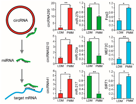 The differentially expressed circRNA-miRNA-mRNA network between LDM and PMM. qPCR was used to detect expression levels of circRNAs, miRNAs, and mRNAs. All data are presented as means ± SEM. Student’s t-test used to calculate statistical significance (* p < 0.05, ** p < 0.01), n = 3.