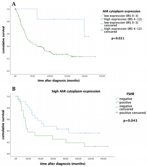 2.4. Cytoplasmic AhR Expression Impairs Survival on its Own and Affects the Role of FSHR in Survival