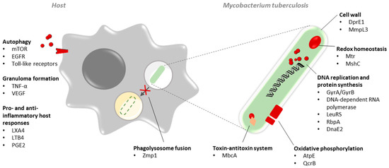 Overview of the emerging mycobacterial targets and host-directed therapies addressed. At the level of Mycobacterium tuberculosis, lethal and non-lethal targets can be found in several interesting pathways including, but not limited to, cell wall biosynthesis, redox homeostasis, DNA replication and protein synthesis, oxidative phosphorylation, toxin–antitoxin system and proteins important for phagosome–lysosome fusion. At the level of the host, targeting important processes such as autophagy, granuloma formation, and pro- and anti-inflammatory responses are invigorated to address and overcome drug resistance.