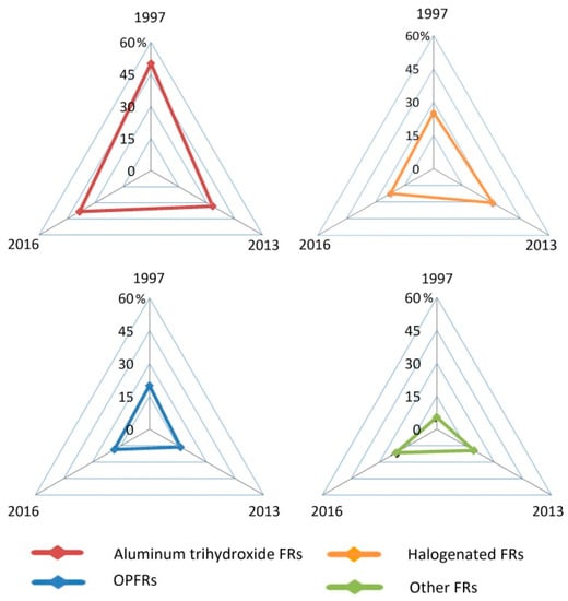 In various flame retardants, different compositions may contain halogens (bromine and chlorine), phosphorus, nitrogen, metals and minerals based on aluminium and magnesium. References [4,72], summarized that there were four major groups of flame retardants, including inorganic, halogenated organic, organophosphate and nitrogen-based flame retardants. The US Consumer Products Safety Commission (CPSC) commissioned the US National Academies to study whether classes of organohalogen FRs could be considered, and pointed out that, in the current age, considering the classes of organohalogen FRs, instead of studying and regulating each chemical separately, is the trend of the times for researchers.