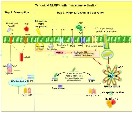 Canonical NLRP3 inflammasome activation requires two parallel and independent steps: Priming (transcription) and activation (oligomerization) (Figure 1) [16]. In the first step, innate immune signaling via toll-like receptor (TLR)-adaptor molecule myeloid differentiation primary response 88 (MyD88) and/or cytokine receptors, such as the tumor necrosis factor (TNF) receptor, promote pro-IL-1β and NLRP3 transcription via nuclear factor-κB (NF-κB) activation. In the second step, the oligomerization and activation of NLRP3 inflammasome lead to caspase-1 activation and, in turn, IL-1β and IL-18 processing and release [16,17]. Different stimuli, including viral RNA, inhibition of glycolytic or mitochondrial metabolism, extracellular osmolarity, α-synuclein (α-syn) and β-amyloid (Aβ) protein accumulation, degradation of extracellular matrix components, and post-translational NLRP3 modification (i.e., phosphorylation and ubiquitination) can initiate NLRP3 inflammasome oligomerization and activation. In addition, the permeabilization of cell membranes to potassium efflux (i.e., mixed lineage kinase domain-like protein (MLKL) activation, exposure to pore-forming gasdermin D, P2X7 purinergic receptor activation by extracellular adenosine triphosphate (ATP), lysosomal damage, and cathepsin release), the consequent release of oxidized mitochondrial DNA, the increase in mitochondrial reactive oxygen species (ROS), and the cardiolipin externalization can activate NLRP3 inflammasome assembly [1,10]. Independently from IL-1β maturation, caspase-1 activation promotes also pyroptosis, a key defense mechanism against microbial infections, which blocks the replication of intracellular pathogens, induces phagocytosis of surviving bacteria, and promotes the release of additional cytosolic proteins, such as high-mobility group box 1 (HMGB1) alarmin, a pro-inflammatory mediator significantly involved in the pathogenesis of several inflammatory chronic diseases [18,19].