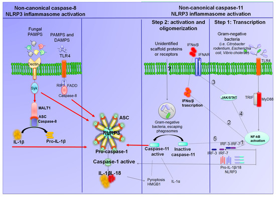 Besides canonical NLRP3 inflammasome activation, a non-canonical activation, which depends on caspase-11 in mice (caspase 4 and caspase 5 in humans), has been characterized (Figure 2) [1]. In this setting, in the first transcription step, gram-negative bacteria (i.e., Citrobacter rodentium, Escherichia coli, Legionella pneumophila, Salmonella typhimurium, and Vibrio cholerae) activate the TLR4–MyD88 and toll/IL-1 receptor homology-domain-containing adapter-inducing interferon-β (TRIF) pathways which, in turn, promote the transcription of IL-1β, IL-18, and NLRP3, as well as interferon regulatory factor (IRF)-3 and IRF7 genes via NF-κB activation. The IRF3–IRF7 complex promotes the expression of interferon (IFN)-α/β which, in turn, activates the IFN-α/β receptor 1 (IFNAR)/IFNAR2- the janus kinase/signal transducers and activators of transcription (JAK/STAT) pathway leading to transcription of caspase-11 gene. In the second step, unidentified scaffold proteins or receptors, induced by Gram-negative bacteria, cleave and activate caspase-11, which induces pyroptosis, HMGB1, and IL-1α release, and promotes IL-1β processing and release through activation of the canonical NLRP3-ASC-caspase-1 pathway (Figure 2) [1].