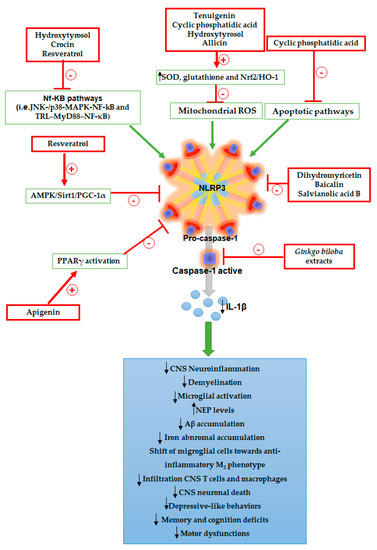 Recent observations have shown that several polyphenols exerted beneficial effects on CNS disorders via inhibition of the primary TRL–MyD88–NF-κB step of NLRP3 inflammasome activation. Zhang et al. [33] showed that crocin, a carotenoid isolated from Gardenia jasminoides and Crocus sativus, counteracted CNS neuroinflammation, locomotor disability, and immobility time, in concomitance with a shift of M1 pro-inflammatory microglia towards M2 anti-inflammatory phenotype, in mice with LPS-induced depression, through the inhibition of NLRP3 transcription step. Qi et al. [34] and Liu et al. [79] reported that treatment with resveratrol (3, 5, 4′-trihydroxystilbene), a stilbenoid endowed with anti-aging, anti-inflammatory, antioxidant, and anti-apoptotic activities [35,80,81], improved cognitive and behavioral functions in mice with AD induced by intracerebroventricular injection of Aβ1-42 as well as in animals with ovariectomy-induced anxiety- and depression-like behaviors, by inhibiting the NF-κB/NLRP3 signaling. Resveratrol has been found to activate the anti-inflammatory 5′-adenosine monophosphate-activated protein kinase (AMPK)/sirtuin1 (Sirt1)/peroxisome proliferator-activated receptor-gamma coactivator-1alpha (PGC-1α) pathway. Such an effect could contribute further to the inhibition of NLRP3 activation. However, the authors did not demonstrate whether resveratrol influenced NF-κB/NLRP3/IL-1β and AMPK/Sirt1/PGC-1α pathways in independent ways, or whether the inhibition/activation of one can regulate the other. Thus, further investigations are needed to characterize the molecular mechanisms underlying the interplay between AMPK/Sirt1/PGC-1α and NF-κB/NLRP3/IL-1β pathways.