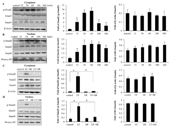 2.5. LF Activates TGF-β/smad2 Pathway Dependent on p38 MAPK Signaling Pathway