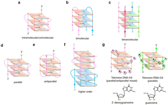 Numerous studies have addressed the effect of loop length and sequence on the DNA-G4 structure; adaptation of the glycosidic bond conformation (syn or anti); the number of molecules of nucleic acid involved in the structure formation, e.g., intramolecular/unimolecular (Figure 2a), bimolecular (Figure 2b), or tetramolecular structures (Figure 2c); and the relative orientation of the strands resulting in parallel (Figure 2d), antiparallel (Figure 2e), and higher-order G-quartets (Figure 2f) [20,21,22]. RNA-G4 is thermodynamically more stable and less polymorphic than DNA-G4 [23]. RNA-G4 topology is predominantly parallel and independent of the loop length, as determined by using RNA oligonucleotide libraries representing individual loop lengths of 1 to 5 nucleotides and total loop lengths of 3 to 15 nucleotides [24]. Telomere DNA-G4 and RNA-G4 structures are shown in Figure 2g. While DNA-G4 may form an equilibrium towards the Watson–Crick double-stranded conformation and is bound to histones in the nucleus, RNA-G4 may form an equilibrium towards various secondary structures (hairpins, loops, bulges, and pseudoknots) with many RNA-binding proteins. RNA may be more prone to form G-quadruplex structures in vivo than DNA, because it lacks a complementary strand. As described above, the basis of the physical topology of G-quadruplex structures has been determined by in vitro analysis. However, it should be noted that it is not yet clear how the in vitro topology translates into in vivo physiology and pathology.