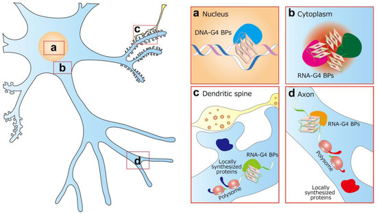 Multiple roles and pharmacological targets of G-quadruplex in the neuron. (a) In the nucleus, DNA-G4 may be involved in transcriptional modifications, telomere maintenance, and epigenetic modifications, together with DNA-G4 binding proteins (BPs). (b) In the cytoplasm, RNA-G4 is involved in the metabolism of RNA granules, including interactions with RNA-G4 BPs and phase separations. (c,d) RNA-G4 is also involved in the transport, stability, translation, and subcellular localization of dendritic (c) and axonal (d) mRNAs. A detailed understanding of these processes will inform a new therapeutic strategy for neurological diseases.