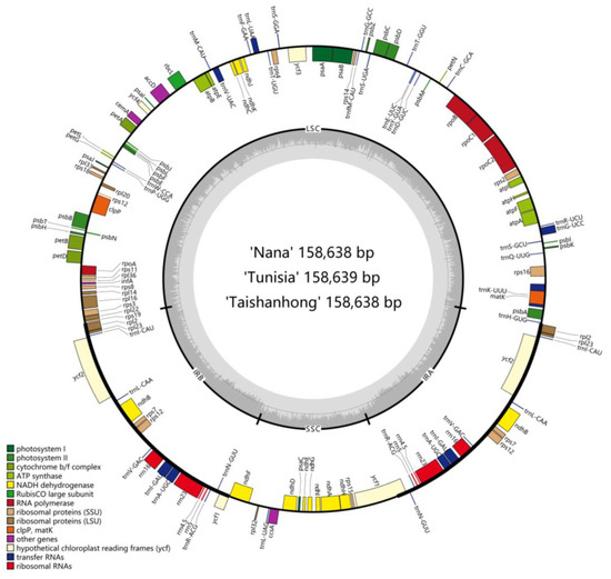 The complete cp genomes of ‘Nana’, ‘Tunisia’, and ‘Taishanhong’ were de novo assembled using whole genome sequencing data with GetOrganelle [27]. The cp genomes of ‘Nana’, ‘Tunisia’, and ‘Taishanhong’ were found to be 158,638, 158,639, and 158,638 bp in size, respectively. All of them exhibited a typical quadripartite structure, consisting of a pair of IRs separated by a large single copy region (LSC) and a small single copy region (SSC) (Figure 1). There are identical sets of 113 genes with the same gene order, including 79 protein-coding, 30 tRNA, and 4 rRNA genes. Six protein-coding genes (rps7, rps12, rpl2, rpl23, ndhB, ycf2), seven tRNA genes (trnI-CAU, trnN-GUU, trnR-ACG, trnA-UGC, trnI-GAU, trnV-GAC, trnL-CAA), and all rRNA genes (4.5S, 5S, 16S, 23S) are located at the IR regions. Eleven of the protein-coding genes and six of the tRNA genes contain introns, 14 of which contain a single intron, whereas three (rps12, ycf3, clpP) have two introns (Table 1). In particular, the rps12 is a trans-spliced gene, whose first exon is located in the LSC, while the second and third exons reside in IRs. The infA gene was identified as a pseudogene because of the accumulation of the premature stop codons [28]. Another pseudogene ycf1 existed because of the incomplete duplication of the normal copy of ycf1 in the IRa and SSC junction, which is identical with previous reports [29,30]. There are some exceptions where non-ATG codons were identified as start codons, such as ACG for psbL, GTG for rps19, and ACG for ndhD. Alternate start codons have been found in other plant species [31]. Alternate start codons are still translated as Met when they are the start of a protein because a separate transfer RNA is used for initiation [32]. The overall GC content was 36.92%; this was consistent with previously reported GC content of IRs (42.78%) being higher than that of the LSC (34.89%) and SSC (30.64%) [33]. The high GC percentage of IRs could be due to the presence of rRNA sequences in these regions [34].