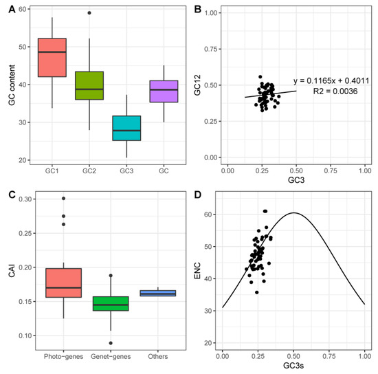 The codon usage pattern of the pomegranate chloroplast (cp) genome. (A) GC content on three different positions. (B) Neutrality plot (GC12 against GC3). (C) The codon adaptation index (CAI) value of gene sets with different functions. (D) Relationship between GC3 and effective number of codons (ENC) (ENC-plot). The expected ENC from GC3 is shown as a solid.