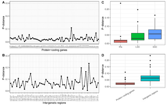 The genetic distance based on Kimura’s two-parameter model. (A) The P-distance value of protein-coding genes. (B) The P-distance value of intergenic regions. (C) Boxplots of P-distance value difference among LSC, SSC, and IRs. (D) Boxplots of P-distance value differences between protein-coding genes and intergenic regions.
