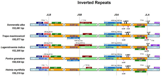 Five complete cp genomes within Lythraceae were selected for comparison with each other. The genome sizes was ranged from 152,205 to 159,219 bp. The length of the LSC, SSC, and IRs varied in the range of 84,046–89,021 bp, 16,914–18,821 bp, and 23,902–25,914 bp, respectively. Lagerstroemia indica has the smallest genome, and this difference is mostly attributed to variation in the length of the LSC and IR regions (Table 4). A detailed comparison on four borders between the two IRs and the two single-copy regions showed that the border structures were highly similar with one another (Figure 4). However, a slight difference in junction positions was observed among these five cp genomes. For instance, the ndhF gene was located at the SSC region in Sonneratia alba, Trapa maximowiczii, Punica granatum, and Heimia myrtifolia, while it varied from 3 to 54 bp apart from the IRb/SSC junction. However, the ndhF gene crossed over the IRb/SSC region in Lagerstroemia indica. The rps19 gene was located in the junction of the LSC/IRb in Trapa maximowiczii, Lagerstroemia indica, and Punica granatum, with 24–83 bp located in the IRb. However, in Heimia myrtifolia and Sonneratia alba, the rps19 gene was fully located in the LSC region, and 4–16 bp apart from the LSC/IRb border. Overall, the IR boundary regions varied slightly in the Lythraceae cp genomes. IR expansion and contraction often results in genome size variations among various plant lineages, which can be used to study the phylogenetic classification and the genome evolution among plant lineages. Three reasons may explain the diversification of the IR boundary region sequences: the first is intramolecular recombination, the second is the presence of multiple repeat sequences, and the third is the indels, which caused a mismatch that resulted in the upstream sequence becoming a single copy [52].