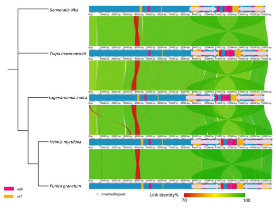 Pairwise alignment of the P. granatum cp genome with the other Lythraceae species revealed a high degree of synteny and gene order conservation (Figure 5), suggesting an evolutionary conservation of the Lythraceae cp genomes at the genome-scale level.