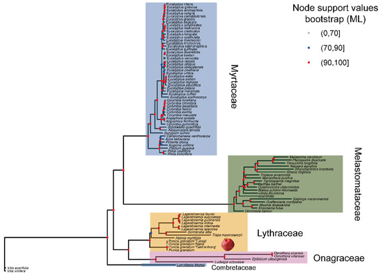 To determine the position of P. granatum and to further analyze the relationships within Myrtales, we used the complete cp genome sequences to perform the phylogenetic analysis. Eighty-five species representing five families from the order Myrtales were selected. Two species from the order Vitales (Vitis acerifolia, Vitis vinifera) were selected as outgroups. To avoid systematic errors produced by poor alignment, we removed poorly aligned sites using Gblocks. After the removal of the ambiguously aligned regions, the alignment contained 106,571 sites in total, including 20,088 parsimony-informative sites, 9178 singleton sites, and 77,305 constant sites. The method of data analysis (ML and BI) did not affect the results, and the treetopologies of ML and BI were found to be the same. The phylogenetic relationships among five families were fully resolved, and node support values for the ML type were higher than 90.