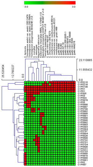 The presence or absence of CYPs in species of Tremellomycetes was shown with heat-maps generated using CYP family data following the method described elsewhere [54,61]. The data were represented as −3 for gene absence (green) and 3 for gene presence (red). A tab-delimited file was imported into multi-experiment viewer (MeV) [62]. Hierarchical clustering using a Euclidean distance metric was used to cluster the data. Twenty-three species of Tremellomycetes form the horizontal axis and 38 CYP families form the vertical axis.