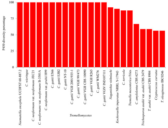 CYP diversity percentage analysis was carried out as described elsewhere [53,57,63,64]. Briefly, the CYP diversity percentage in species of Tremellomycetes was measured as a percentage contribution of the number of CYP families in the total number of CYPs.