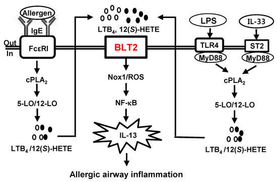 Scheme of BLT2-dependent lipopolysaccharide/Toll-like receptors 4 (LPS/TLR4), interleukin (IL)-33/ST2, or allergen/ high-affinity IgE receptor (FcεRI) immune response signaling pathways responsible for IL-13 synthesis in mast cells, contributing to the allergic airway inflammation. Mast cells activation by allergen/FcεRI, LPS/TLR4, or IL-33/ST2 stimuli activates cytosolic phospholipase A2(cPLA2)-5-/12-LO-BLT2 cascades and induces allergic airway inflammation by significantly increasing Th2 cytokines synthesis (e.g., IL-13) production via the reactive oxygen species-nuclear factor kappa-light-chain-enhancer of activated B cells (ROS-NFκB) pathway.