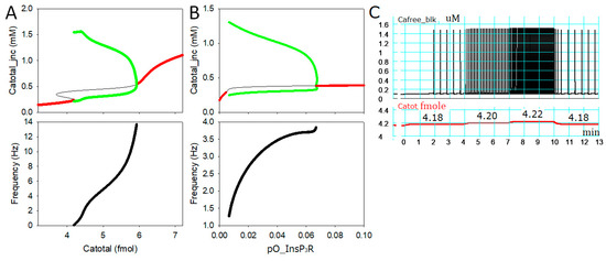 Bifurcation diagrams of the Ca2+ dynamics model: (A) A bifurcation diagram with the total Ca2+ content within the cell on the abscissa and total amount of Ca2+ within the junction space (jnc; [Ca2+tot]jnc) on the ordinate (upper) and the corresponding frequency is shown with the same parameter as in the upper panel on the abscissa (bottom); (B) a bifurcation diagram with the open probability of type II inositol 1,4,5-trisphosphate receptors (pO_InsP3R) on the abscissa and total amount of Ca2+ within the jnc ([Ca2+tot]jnc) on the ordinate (upper) and the corresponding frequency is shown with the same parameter as in the upper panel on the abscissa (bottom). Stable equilibrium points, unstable equilibrium points and stable limit cycles were plotted in red, black and green respectively in the upper panels of A and B; (C) results of time integration calculated using the same Ca2+ dynamics model as in (A). Catot was changed as indicated in the lower panel in (C), and the spontaneous frequency was 0.04, 0.16, and 0.29 Hz at 4.18, 4.20, and 4.22 femtomole Catot, respectively. Note, the Ca2+ transient ([Ca2+]blk) is plotted in (C) instead of [Ca2+tot]jnc in the bifurcation diagram. The [Ca2+]jnc is the key factor initiating the spontaneous Ca2+ release.