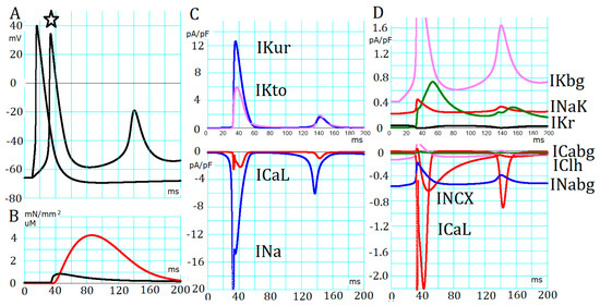 Membrane excitation in the absence of adrenergic (AR) stimulation: (A) Two records of action potential evoked by applying −5 (3 ms in duration) or –0.5 pA/pF (180 ms) current pulses were superimposed. The star mark indicates an action potential (AP) evoked with a smaller pulse; (B) the Ca2+-transient (black, μM) and the developed force of contraction (red, mN/mm2); (C,D) membrane currents shown at a low gain and at a high gain, respectively. Outward and inward currents are shown in the upper and the lower panels, respectively. Resting potential = −66.0 mV, [Na+]cyt = 5.7 mM, [K+]cyt = 117 mM, and [Ca2+]SRrl = 0.71 mM.