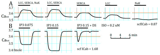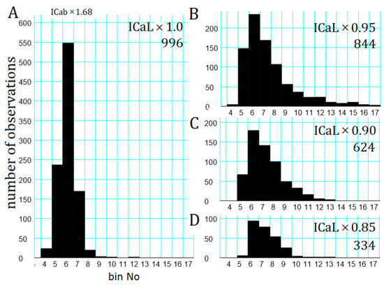 The latency was measured by constructing a latency histogram from several data sets of 1000 trials of the AR stimulation, as shown in Figure 6, where each data set was obtained at the control Catot (scfICab = 1.68) but at different amplitudes of ICaL. In the control run (ICaL × 1.0, Figure 6A), the burst was successfully evoked in 996 trials, and the histogram showed a peak at bin No. 6 of 2.5–3.0 min. The success rate evoking a repetitive APTDs was sensitive to the amplitude of ICaL (Figure 6B–D), and the success rate drastically decreased to 33.4% by reducing the amplitude of ICaL by 15% (Figure 6D). This success rate is near to that (26.7%) obtained in the experimental study [7]. The size of Ca2+ influx due to the activation of ICaL and the uptake of Ca2+ into SR by SERCA play a key role in determining the time-dependent increase in Catot. Note, the [Ca2+]nd is largely dependent on [Ca2+]SRrl when a continuous Ca2+ leak is generated by both InsP3Rs and leak conductance of couplons.