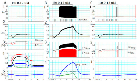 Initiation of a train of APTD by the α1-adrenergic receptor (AR) stimulation. The application of 0.12 μM ISO and 0.15 μM IP3 is indicated by the horizontal bars at the top of each column and the pair of vertical lines. (A) APTD was not induced. (B,C) The random triggering signals applied are shown in the lower part of B1 and C1 (random (RND) stim) to induce APTD. The responses of Vm (1), Catot (2), [Ca2+]SRup and [Ca2+]SRrl (3), and [Na+]i (5 in A and 4 in B,C) are shown in each column. The time courses of afICaL (×0.5, red), afSERCA (black), afNa/K (blue), and pOInsP3R (×100, green) shown in Figure 5(A4) are applicable to responses in (B,C). The rate of APTD discharge (/min/100) appears only in Figure 5(B4). The horizontal green and brown lines are the threshold Catot measured in the absence and presence of AR stimulation, respectively.