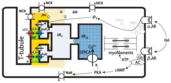 Figure 7 shows a schematic representation of the model structure of a rat PVC. The T-tubule membrane provides the counterpart of the dyadic junction for the CICR. According to the Hinch model of the CaRU [14,15], individual CaRU is composed of one or a few number of LCC on the T-tubule membrane facing the couplons (clusters of RyRs) on the SR membrane. For activation and inactivation, both couplons and LCC refer to the same local Ca2+ concentration in the nanodomain (nd) cleft depicted in green. Each CaRU is separated from the others to support the local control of CICR, but a moderate cooperativity of multiple CaRUs is conserved by a local Ca2+ domain called jnc, which allows a temporal accumulation of released Ca2+ as firstly described in the HuVEC model [16,47]. Ca2+ accumulated in jnc gradually diffuses to iz and then to blk, in which myofilaments are located. Increased Ca2+ in each compartment is partly extruded by NCX. Note, only two representative CaRUs are demonstrated among many numbers of CaRUs in Figure 7. All CaRUs share a single common Ca2+ uptake site of the network SR spread in the blk for computational simplicity.