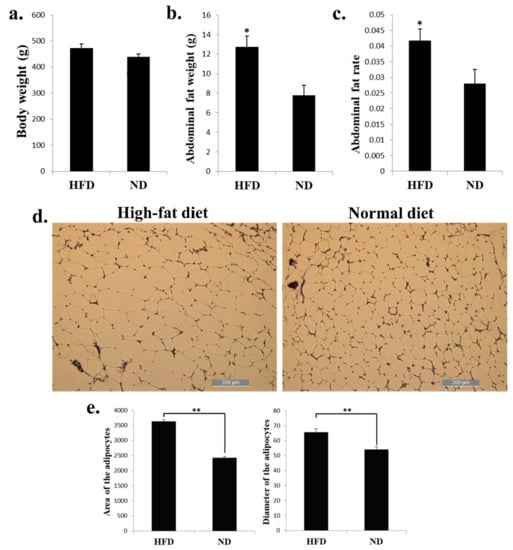 HFD can induce the expression of genes involved in adipogenesis and fat deposition. To find the genes and pathways related to chicken abdominal fat deposition, we fed the 8-week-old chickens with HFD and ND for 2 weeks, and the livers and abdominal fats were collected for further analysis. For the phenotypic changes of the chickens, the body weight of chickens fed with HFD have no significant change than the chickens fed with ND (Figure 1a). However, the abdominal fat weight and abdominal fat rate were significantly increased in HFD chickens than in ND chickens (Figure 1b,c). The adipocytes of the HFD chicken abdominal fat looks bigger than the ND group (Figure 1d). After calculated the area and diameter of the two groups’ adipocytes, we found that the HFD chickens have larger adipocytes area and longer adipocytes diameter than in ND chickens (Figure 1e). Therefore, these results demonstrated that a high-fat diet can promote chicken abdominal fat deposition and induces adipocyte hypertrophy.