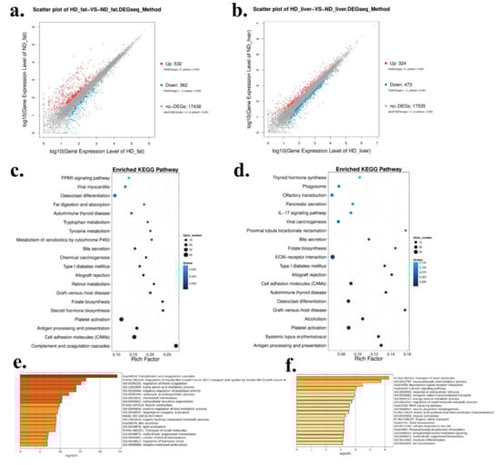 Differentially expressed genes between HFD and ND chickens. (a) Scatter plot of differentially expressed genes (DEGs) between HFD and ND chickens in abdominal fat. (b) Scatter plot of DEGs between HFD and ND chickens in liver. (c) Enriched Kyoto Encyclopedia of Genes and Genomes (KEGG) pathway of DEGs between HFD and ND chickens in abdominal fat. (d) Enriched KEGG pathway of DEGs between HFD and ND chickens in liver. (e) Gene Ontology (GO) enrichment of DEGs between HFD and ND chickens in abdominal fat. (f) GO enrichment of DEGs between HFD and ND chickens in liver.