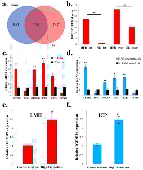 Next, we want to find genes which are not only differentially expressed in abdominal fats, but also differentially expressed in livers between HFD and ND chickens. We found a total of 146 genes were suitable for this condition (Figure 3a and Supplementary File 3). Among these 146 genes, IGF2BP1, which is an IGF2 mRNA binding protein and play important role in many cellular processes, was differentially expressed between HFD chickens and ND chickens (Figure 3b). To exam the quality and accuracy of RNA-seq, we used qPCR to validate the expression of six random DEGs that were among the 146 genes. Results confirmed the qPCR results were consistent with the RNA-seq results (Figure 3c,d). Finally, to verify whether high-fat condition can also induce IGF2BP1 expression at the cellular level, we used high-fat medium and normal medium (control group) to culture chicken LMH cell and ICP cell. After 48 h of culture, IGF2BP1 expression can be significantly induced by high-fat medium in both cell lines (Figure 3e,f). Therefore, these results suggest that the expression of IGF2BP1 can be induced in a high-fat condition.