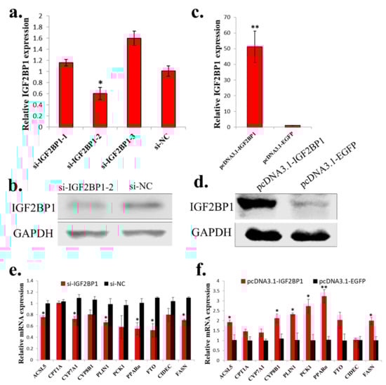 To study the function of IGF2BP1 in chicken liver, we synthesized IGF2BP1 specific siRNA and constructed IGF2BP1 overexpression vector. Among three synthesized IGF2BP1 specific siRNAs, only one of them can significantly inhibit IGF2BP1 expression in LMH cell (Figure 4a,b), so we then used this siRNA to do the following study. For IGF2BP1 overexpression, transfection of pcDNA3.1-IGF2BP1 plasmid can significantly induce IGF2BP1 expression (Figure 4c,d). Because the liver is important for fatty acid metabolism, we then test the function of IGF2BP1 on the expression of genes implicated in this process. Results showed that IGF2BP1 inhibition in LMH can repress the expression of many genes related to fatty acid metabolism (Figure 4e), and the overexpression of IGF2BP1 induced these genes expression (Figure 4f). Therefore, these results indicated that IGF2BP1 promotes the expression of genes involved in fatty acid metabolism in LMH cell.