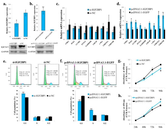 Because IGF2BP1 is an IGF2 mRNA binding protein, and the IGF2 is an important growth factor, we then test the function of IGF2BP1 in chicken adipocyte growth. The IGF2BP1 specific siRNA can also inhibit IGF2BP1 expression in an ICP cell (Figure 5a), and the IGF2BP1 overexpression vector can promote IGF2BP1 expression in an ICP cell (Figure 5b). IGF2BP1 inhibition reduced the expression of genes involved in cell cycle pathway (Figure 5c), and the overexpression of IGF2BP1 promoted the expression of these genes (Figure 5d). Additionally, IGF2BP1 inhibition increased the cell populations arrest in the G1 phase but decreased the cell populations in the S phase (Figure 5e). IGF2BP1 overexpression decreased the cell populations arrest in the G1 phase but increased the cell populations in the S phase (Figure 5f).These results suggesting that the IGF2BP1 may promote cell proliferation by inducing cell cycle-related genes. Finally, CCK-8 assays also showed that IGF2BP1 is able to increases cell number in an ICP cell (Figure 5g,h). Therefore, these results indicate that IGF2BP1 promotes chicken adipocyte proliferation.