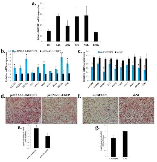 Next, we test the function of IGF2BP1 in adipogenesis. During ICP cell differentiation, IGF2BP1 expression was immediately up-regulated after ICP cells were induced to differentiation at 24 h, but its expression was reverted to a low level at 120 h after differentiation (Figure 6a). Overexpression of IGF2BP1 promoted adipocyte differentiation marker genes expression, and the genes related to fatty acid metabolism such as PCK1, PPARα, and FTO were also increased (Figure 6b). On the other hand, IGF2BP1 inhibition repressed adipocyte differentiation marker genes expression, and the expression of genes which related to fatty acid metabolism were also decreased (Figure 6c). To investigated whether IGF2BP1 can further affect lipid droplet accumulation during ICP differentiation, we transfected IGF2BP1 overexpression vector or siRNA to the ICP and then induced the cells to differentiation for 48 h. As judged by oil red O staining and extraction assays, IGF2BP1 overexpression significantly increased lipid droplet accumulation (Figure 6d,e), whereas IGF2BP1 inhibition decreased lipid droplet content relative to control (Figure 6f,g). Taken together, these data indicate that IGF2BP1 promotes chicken adipocyte differentiation and increases lipid droplet accumulation.