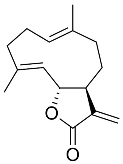 - Rasul, A.; Parveen, S.; Ma, T. Costunolide: A novel anti Costunolide: A novel anti-cancer sesquiterpene lactone cancer sesquiterpene lactone cancer sesquiterpene lactone. Bangladesh J. Pharmacol. 2012, 7, 6–13. [Google Scholar] [CrossRef]