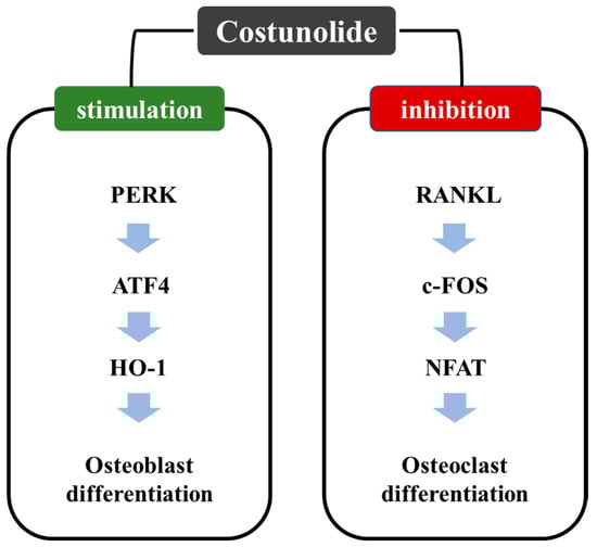 Effect of costunolide on differentiation of osteoblast and osteoclast. Costunolide induces osteoblast differentiation through ATF-4-induced HO-1 expression in mesenchymal stem cells. On the other hand, costunolide suppressed RANKL-mediated osteoclast differentiation via inhibiting RANKL-mediated c-Fos transcriptional activity in bone marrow cells.