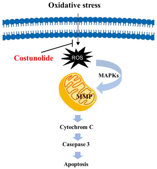 The effect of costunolide on apoptosis of neurons. Costunolide reduced intracellular ROS caused by oxidative stress. As a result, mitochondrial membrane potential (MMP) stabilized and apoptosis-related proteins such as caspase 3 decreased.