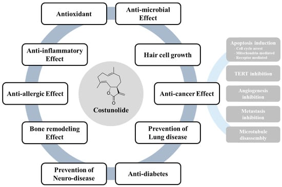 Sesquiterpene lactones form a large, structurally diverse group of natural products found almost universally in plants. Extensive investigation of the therapeutic potential of sesquiterpene lactones has yielded important candidates for pharmaceutical development []. Costunolide is a well-known sesquiterpene lactone, which has been isolated from various plant species. As has been discussed in earlier sections, costunolide has been reported to possess antioxidant, anti-inflammatory, antiallergic, bone remodeling, neuroprotective, antimicrobial, hair growth promoting, anticancer, and antidiabetic properties (Figure 4 and Table 2). Limited pharmacokinetic studies have also shown that the compound can be bioavailable. However, the majority of these studies have been conducted in cultured cells or using an in vitro system. Considering the therapeutic value of the compound, it would be interesting to further examine the effects of costunolide in various other animal models to reveal the subacute and chronic toxicities, detailed elucidation of molecular mechanisms of action, and structural modifications to develop new therapeutics based on costunolide or its derivatives.
