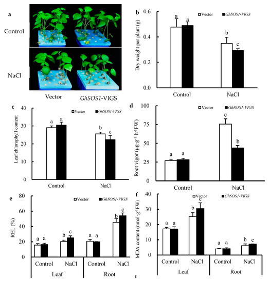 Effects of salt treatment on the growth (a), dry weight per plant (b), leaf chlorophyll content (c), root vigor (d), relative electrolytic leakage (REL) value (e), and MDA content (f) in the leaves and roots of GhSOS1-VIGS (virus-induced gene silencing) cotton plants. Different lowercases in the same group indicate the significant differences (p ≤ 0.05).