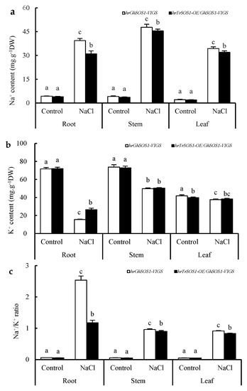 Changes in contents of Na+ (a) and K+ (b), and Na+/K+ ratio (c) in the roots, stems, and leaves of the GhSOS1-VIGS cotton plants under salt stress. Different lowercases in the same group indicate the significant differences (p ≤ 0.05).