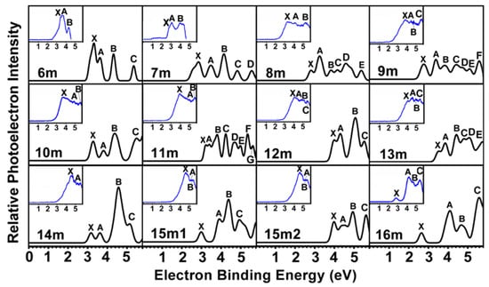 Photoelectron spectroscopy (PES) spectra of the most stable ZrSin- (n = 6–16) clusters. The inserts show the experimental PES spectra taken from [22,23].