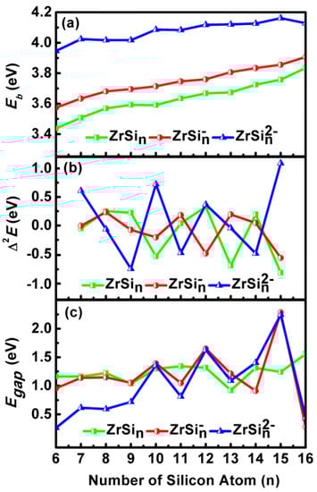 Size dependences of (a) average bonding energy (Eb). (b) second energy difference (∆2E), and (c) HOMO-LUMO energy gap (Egap) for the ground state ZrSin0/-/2- (n = 6–16) clusters.