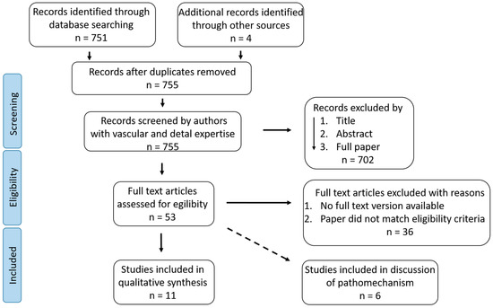 Preferred Reporting Items for Systematic Reviews and Meta-Analyses (PRISMA) flow diagram, the detected studies regarding the pathomechanism were also inserted into the PRISMA diagram (represented by a dashed line).