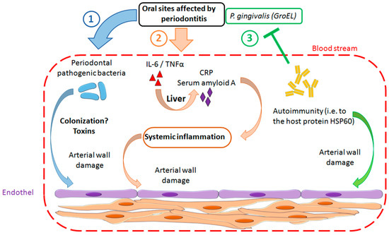 Potential pathomechanism that may be involved in the association of PD and PAOD; (1) periodontal pathogenic bacteria enter the bloodstream, invade and damage the arterial wall; (2) release of inflammatory mediators into the bloodstream, such as serum amyloid A, interleukin-6 (IL-6), tumor necrosis factor α (TNFα), and C-reactive protein (CRP) causing a systemic inflammation that also damages the arterial wall; (3) autoimmunity to host proteins (i.e., heat shock protein 60, HSP60) resulting from the host immuno response to the bacterial proteins, such as the HSP60 homolog GroEL.