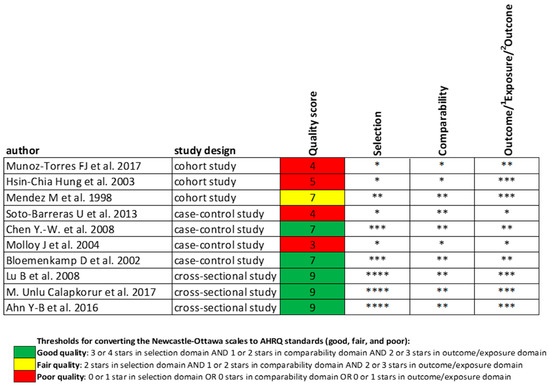 The risk of bias was assessed by using the Newcastle–Ottawa Scale [44] for case-control studies and cohort studies. For the quality assessment of cross-sectional studies, we used a modified version of the Newcastle–Ottawa Scale [45]. The results of the quality assessment are shown in Figure 4.