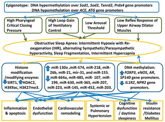 In this review, we have highlighted the growing importance of the epigenetic regulation of adaptive and maladaptive responses to IHR in OSA. Figure 1 shows proposed model of the epigenetic regulations in OSA based on the results of the cohort studies, in vitro IHR experiments, and CIH-exposed animal studies. We need to understand this heterogeneity and mechanisms that underlie systemic responses to IHR, intermittent hypercapnia, sleep fragmentation, and alternating sympathetic/parasympathetic hyperactivity in short and long time domains. In this regard, of particular interest is the potential for epigenetic mechanisms to regulate oxidative stress, cardiovascular remodeling, cognitive dysfunction, and inflammation responses acutely and throughout life in OSA. Epigenetic regulation of various end organs during chronic IHR is an important area for future research.