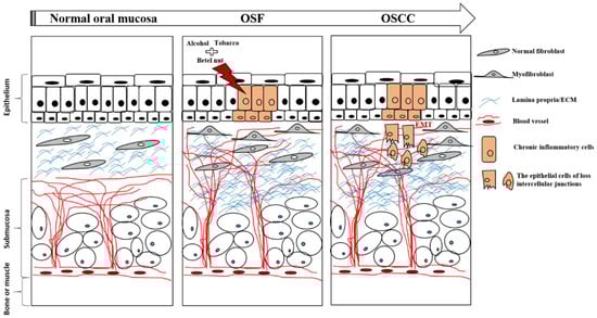 OSF constitutes a failure in the wound healing process following chronic persistent injury to the oral mucosa []. Paymaster first identified the malignant potential of OSF in 1956 but its mechanisms have not yet been elucidated []. The high mortality rate associated with oral squamous cell carcinoma (OSCC) is the result of late diagnosis of the malignant potentiality of its associated precancers [,]. Malignant transformation in the OSF background is complex. It involves numerous pathways and molecules associated with hypoxia, the cell cycle, angiogenesis, and epithelial mesenchymal transition [].