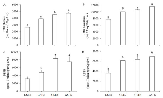 Total phenols were measured according to our modification of the Folin–Ciocalteu method [47]. In brief, Folin–Ciocalteu solution was added to a 96-well plate and sample solutions were added to individual wells. Then, Na2CO3 solution was added to each well and the plate was shaken in an orbital shaker. The microplate was incubated until absorbance measurement at 765 nm. Results are expressed as mg gallic acid equivalent (GAE)/100 g dry weight (d.w.) GSE. Total flavonoids were estimated using a modified aluminum chloride colorimetric assay [47]. Briefly, sample solutions were added to the wells of a 96-well microplate, followed by addition of NaNO2 to each well. After mixture, AlCl3 and NaOH were successively added before reading the absorbance. Results are expressed as mg rutin equivalent (RTE)/100 g d.w. GSE.