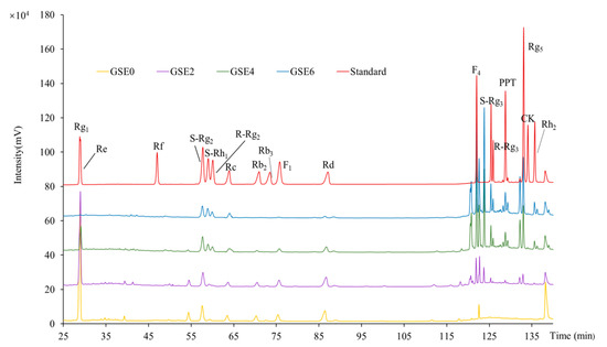 High-performance liquid chromatography (HPLC) profiles of 18 pure standards of ginsenosides and GSEs (ginseng shoots extracts) steamed for different times. High-performance liquid chromatography (HPLC) profiles of 18 pure standards of ginsenosides (red curve) and GSEs steamed for different times: unsteamed GSE (GSE0; yellow curve) and GSEs steamed at 120 °C for 2 h (GSE2; purple curve), 4 h (GSE4; green curve), and 6 h (GSE6; blue curve).