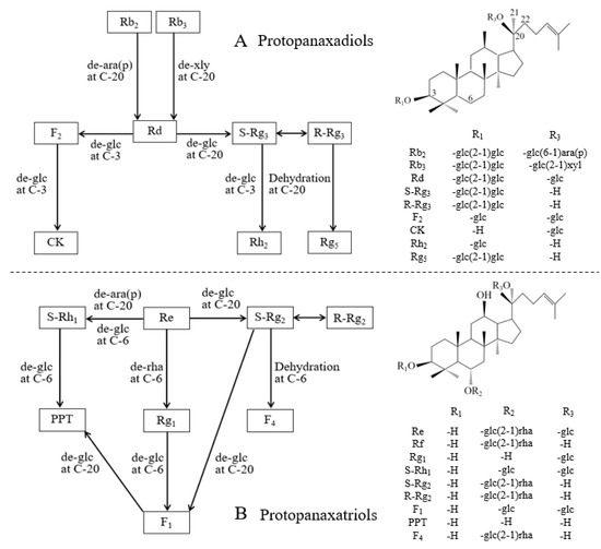 Chemical structures and possible transformation mechanisms of 18 representative ginsenosides in steamed GSEs. (A) Protopanaxadiols; and (B) protopanaxatriols. Glc, α-D-glucopyranosyl; Ara(f), α-L-arabinofuranosyl; Ara(p), α-L-arabinopyranosyl; Rha, α-L-rhamnopyranosyl; and Xyl, β-L-xylopyranosyl. Chemical links between C-20 and C-22 of F4 and Rg5 are double bonds.