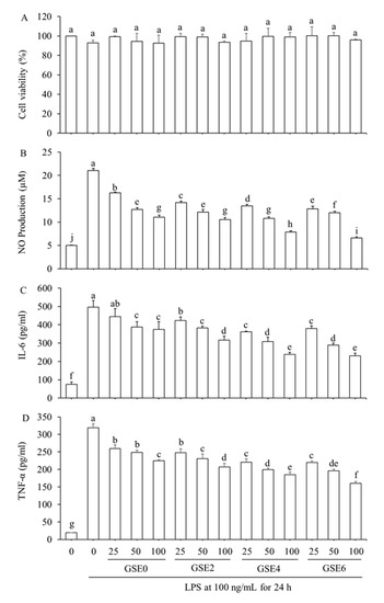 Effects of GSEs steamed for different times (0–6 h) on viability, nitric oxide (NO) production and the levels of two inflammatory cytokines in lipopolysaccharide (LPS)-induced RAW264.7 cells. (A) Relative cell viability; (B) NO production; (C) interleukin (IL)-6 level; and (D) tumor necrosis factor (TNF)-α level. RAW264.7 cells were pretreated with various concentrations (25, 50, or 100 µg mL−1) of GSE0, GSE2, GSE4, or GSE6 or vehicle for 2 h and then treated with 100 ng mL−1 LPS for 24 h. Results are representative of three independent experiments and are presented as means ± SD. Different letters indicate significant differences at p < 0.05 based on Duncan’s multiple range test.